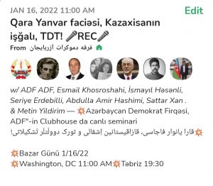 Tədbirimizin mövzusu “Qara Yanvar faciəsi, Qazaxıstanın işğalı”dır. Bütün Azərbaycan Demokrat Firqəsinin üzvlərini, tərəfdaşlarını müzakirələrdə yaxından iştiraka dəvət edirik.