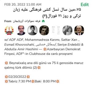 Azərbaycan Demokrat Firqəsi bu il fevralın 20-də 3-cü konfransını keçirəcəkdir. Tədbir “Beynəlxalq ana dili günü və 75 il genosidə məruz qalmış türk dilimiz” adlanır. ADF rəhbərlərinin, üzvlərinin, fəallarının və tərəfdaşlarının iştirakı ilə baş tutacaq canlı seminarda mövzu ətrafında geniş müzakirə aparılacaqdır.