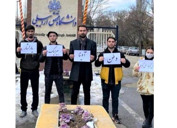 Mühəqqiq Ərdəbili Universitetinin önündə sıra ilə dayanmış tələbələrin əllərində tutduqları lövhələrdə yazılıb (sağdan sola):