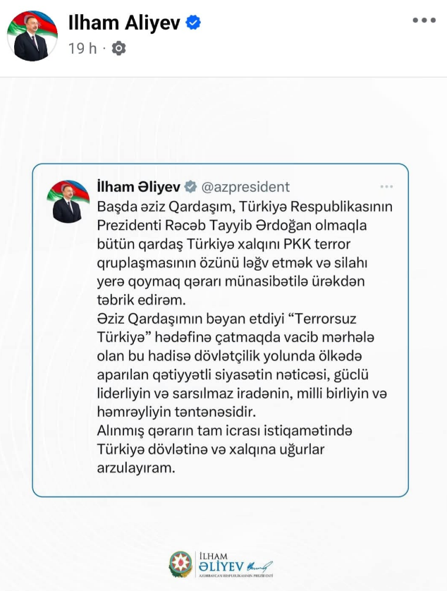 Azərbaycan Respublikasının Prezidenti İlham Əliyev PKK terror qruplaşmasının özünü ləğv etməsi ilə əlaqədar Türkiyə xalqını təbrik edib.
