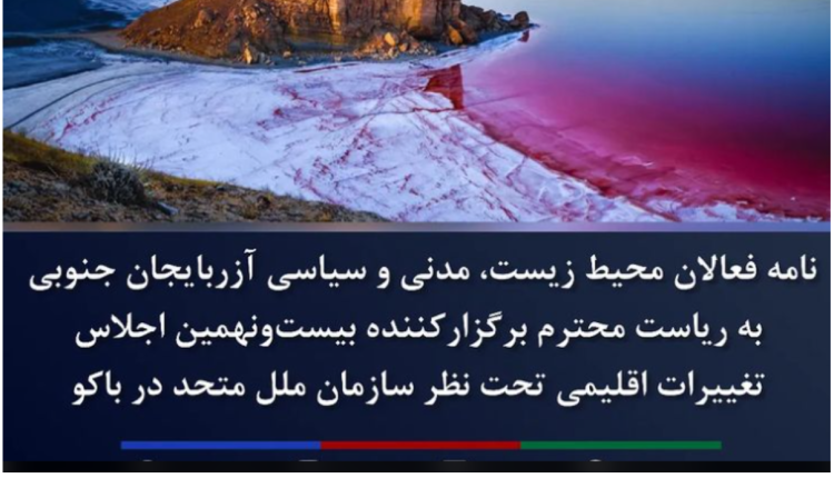 در راستای پاسداری از سرمایههای محیط زیستی که دارایی مشترک تمامی انسانهاست، مایلیم بخشی از مشکلات عمده محیط زیستی را که به دلیل عملکرد حاکمیت غیرمردمی، غیردموکراتیک و غیرپاسخگوی ایران در آزربایجان جنوبی به وجود آمده است، به اطلاع مدیریت اجلاس COP29 که هماکنون به میزبانی جمهوری آزربایجان در حال برگزاری است، برسانیم.
