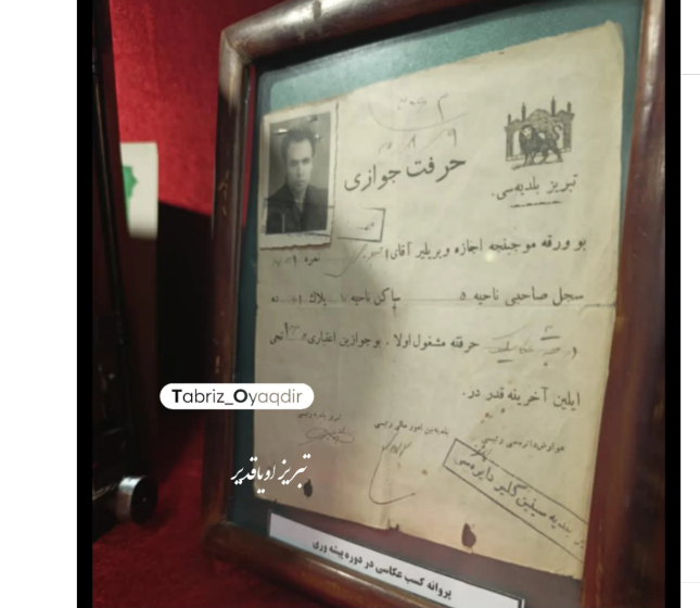 پروانه کسب و جواز حرفه در زمان پیشه وری در تبریز، عکس از موزه برج آزادی تهران گرفته شده است سیاست По . سون یئنیلنمه پایلاش