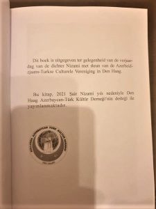 Haaqa şəhərində fəaliyyət göstərən Hollanda Azərbaycan-Türk Kültür Dərnəyinin maddi dəstəyi ilə “Azərbaycanlı şair Nizami” kitabı çap edilmişdir.