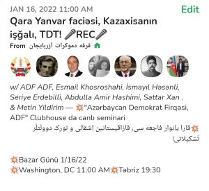 Yanvarın 16-da Clubhousda, Azərbaycan Demokrat Firqəsinin cari ildə ilk konfranı keçirilib. Otağa toplaşanlar bu  mövzunu müzakirə ediblər: “20 Yanvar faciəsi, Qazaxstanın işğalı və Türk dövlətlər təşkilatı”.