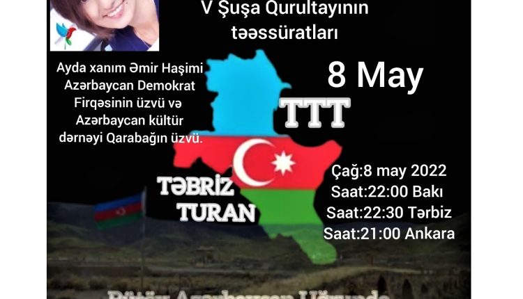 8 may 2022-ci ildə Bakı vaxtı ilə saat 22:00-da, Təbrizdə 22:30-da və Ankarada 21:00-da “Təbriz Turan”da keçirilən toplantıda dinləyicilərin qonağı Azərbaycan Demokrat Firqəsinin və Azərbaycan kültür dərnəyi Qarabağın üzvü Ayda xanım Əmir Haşimi tamaşaçıların qonağı olacaq.