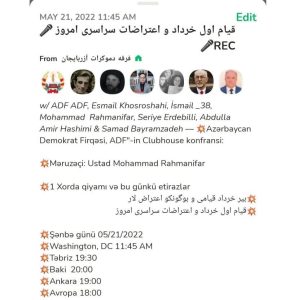 Azərbaycan Demokrat Firqəsi şənbə günü Clubhouse otağında “Bir xordad qiyamı və bu günkü sərasər etirazlar” adlı konfrans təşkil edəcəkdir. Tədbirdə mövzuya aid professor Mohammad Rəhmanifər çıxış edəcək, həmçinin Azərbaycan Demokrat Firqəsinin məsul şəxsləri tərəfindən, ADF-nin mövqeyi açıqlanacaq, bir sıra sorgu-suallara cavab veriləcəkdir.