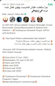 Məruzəçi, ADF-nin Beynəlxalq əlaqələr məsulu Abdulla Əmir Haşimi Cavanşirin auditoriyaya təqdim etdiyi məruzə müzakirə obyekti olacaqdır. Tədbir Təbriz vaxtı ilə 19:30-da, Bakı vaxtı ilə isə 20:00-da başlanacaqdır. Bundan başqa Ankaralı dinləyicilər saat 19:00-da, Avropada yaşayanlar isə saat 18:00-da iştirakçılar sırasına qoşula bilərlər. Hamını verilişin iştirakçısı olmağa səsləyirik.
