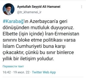 Xameneinin paylaşımı belədir: “Qarabağın Azərbaycana geri qayıtmasını alqışlayırıq. Əlbəttə, işin içində İran-Ermənistan sərhədlərinin bloklanması siyasəti varsa, İslam Respublikası buna qarşı çıxacaqdır, çünki bu sərhəd min illik bir nəqliyyat yoludur”.