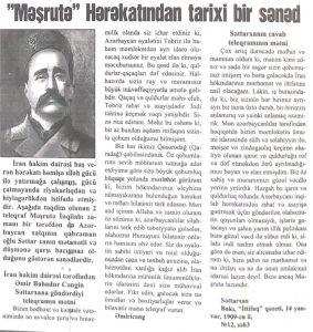 İranın hakim dairələri həmişə baş verən həkəratları, üsyanların və milli etirazların yatırılması üçün gücü çatanda silaha əl atıb, çarəsiz qalanda riyakarlıq və hiyləgərlik dadına çatıb. Sizə təqdim olunan 2 teleqraf Məşrutə inqilabı zamanından yadigardır. Bir sənəddə Məşrutə hərəkatının rəhbəri igid Səttərxanın mətanəti və düşmənə qarşı barışmaz münasibəti, digərində isə onunla Qəsərdağ(Qaradağ) bölgəsindən olan Əmir Bahadur Cəngə verilən ibrətamiz cavab. Tarixilik baxımından əhəmiyyət daıyan hər iki sənədi oxuculara təqdim edirik.