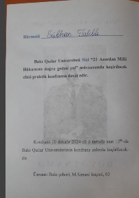 10 dekabr 2024-cü il tarixində Bakı Qızlar Universitetində “21 Azərdən Milli Hökumətə gedən yol” mövzusunda konfrans keçirildi Paylaş