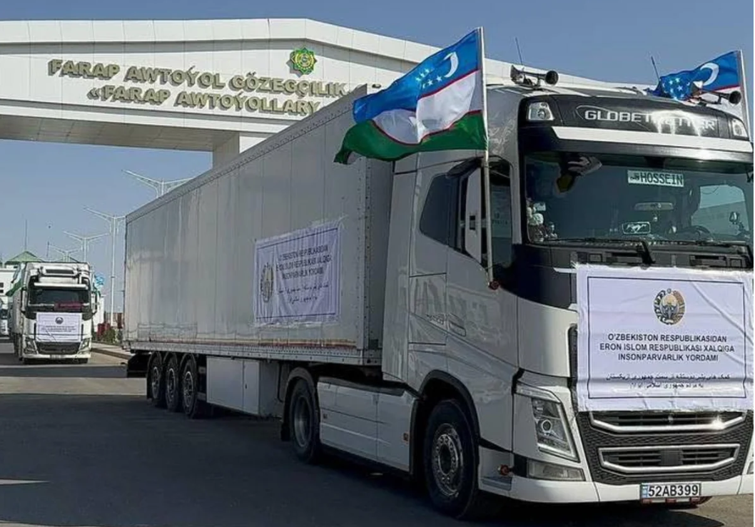 Özbəkistan da bir neçə yük maşını ilə İran xalqı üçün humanitar yardım çatdırıb. Yük özündə ərzaq məhsullarını – un, düyü, şəkər, makaron, günəbaxan yağı, konservləri, həmçinin dərman preparatları və tibbi ləvazimatları ehtiva edir. Bu gün Tacikistanda İrana ümumi həcmi 3610 ton olan humanitar yardım göndərib. Ora 45 ton dərman preparatları, gigiyena vasitələri, uşaq geyimləri, müxtəlif ərzaq məhsulları, ilk zərurət əşyaları, yataq dəstləri, çadırlar, tikinti materialları və digər mallar daxildir.