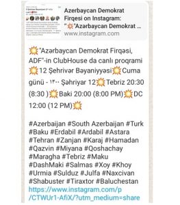 Əziz oxucular, 12 şəhrivər 1400-3 sentyabr 2021-ci ildə Azərbaycan Demokrat Firqəsinin (ADF) 76-cı ildönümü münasibətilə “12 Şəhrivər Bəyaniyəsi” adlı “Clubhuos”da canlı konfrans keçirildi. Konfrans göstərilən tarixdə, cümə günü Təbriz vaxtı ilə saat 20:30-da baş tutdu. Konfransda bir çox soydaşlarımız və “21 Azər” hərəkatının sevdalıları, o cümlədən Azərbaycan Demokrat Firqəsinin sədri sayın Rəhim Hüseynzadə və firqəmizin funksionerləri iştirak edirdilər. Çıxış edənlər Azərbaycancan Demokrat Firqəsinin Mərkəzi Komitəsinin üzvü, sayın Dr.Səməd Bayramzadə, sayın İsmayıl Xosrovşahi, sayın Səriyyə xanım Ərdəbilli, sayın Abdulla bəy Əmir Haşımi Cavanşir və otağın hörmətli admini sayın Rəhim bəy Şahbazi idi.