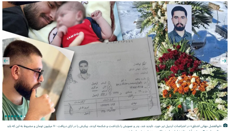 پیکر ابوالفضل جهانی اشتلق پس از چهار شبانه روز در بهشتزهرای اردبیل پیدا شد؛ جایی که به گفته خانواده، اجساد جانباختگان روی هم انباشته شده و مثل تپه بالا رفته بود. پدرش تا روز خاکسپاری ابوالفضل آزاد نشد.